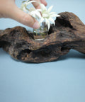 A sculptural piece of driftwood, naturally shaped by time & tide. Its deep, weathered tones and organic contours wrap around a central cavity fitted with a glass tube for fresh flowers. This is truly a one-of-a-kind vase.